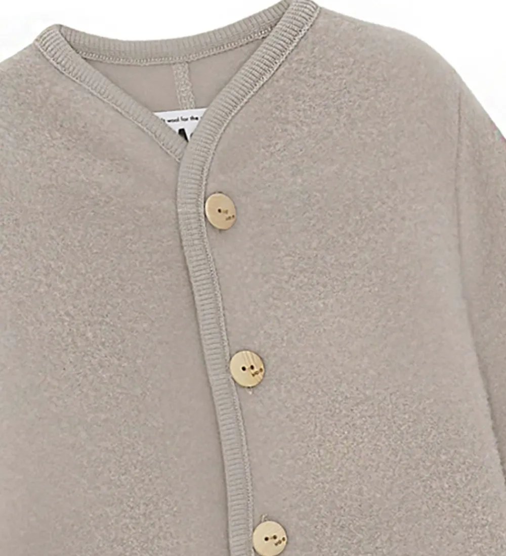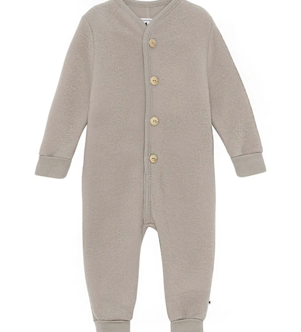 Lækker Molo fleecedragt i beige med et rosa skær, med gennemgående knapper i træ langs fronten.