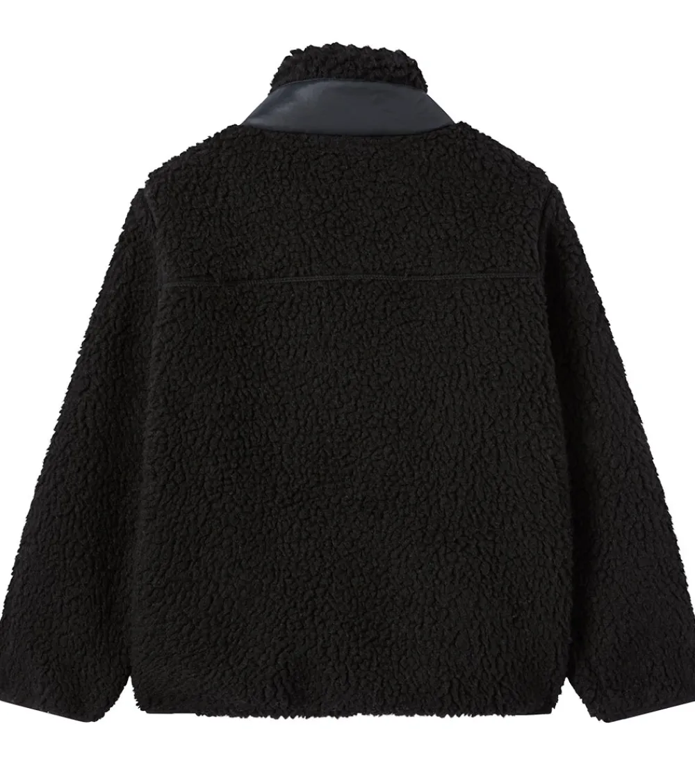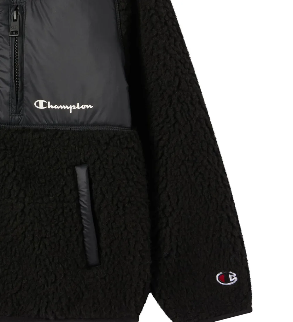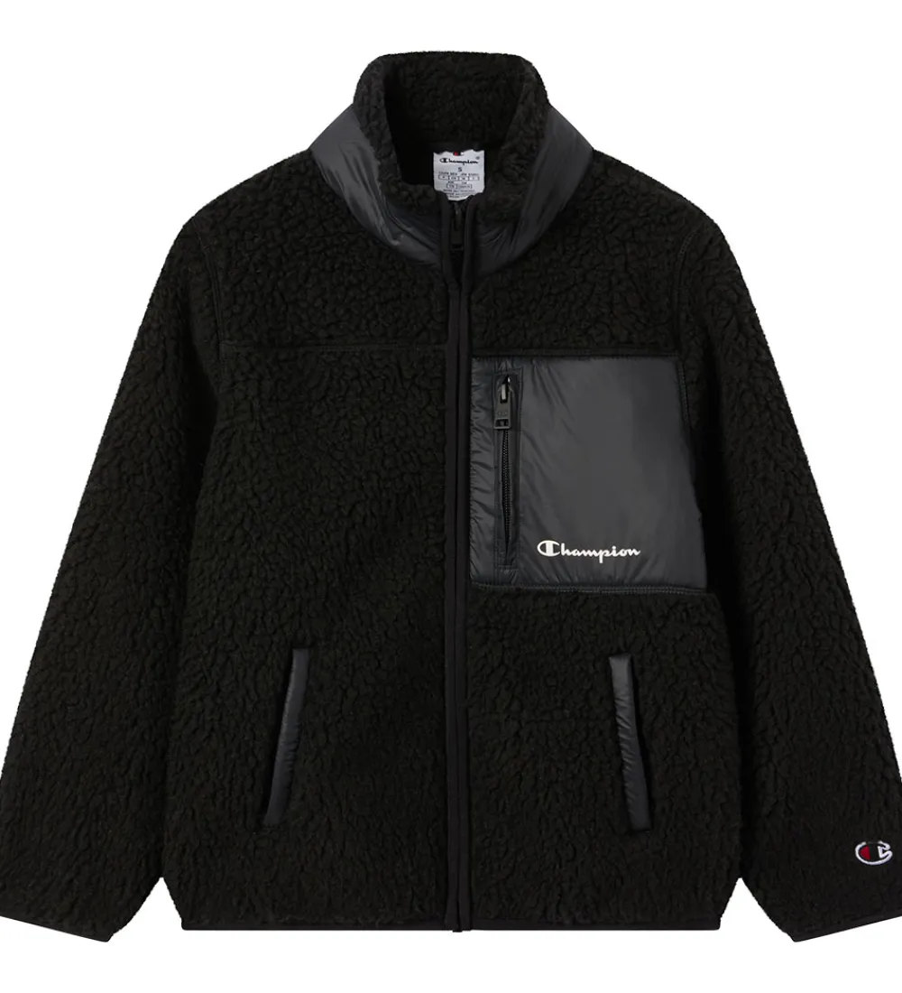 Lækker Champion fleecejakke i sort teddyfleece. Fleecejakken har et sort glatvævet panel på brystet med et hvidt Champion-logo.
