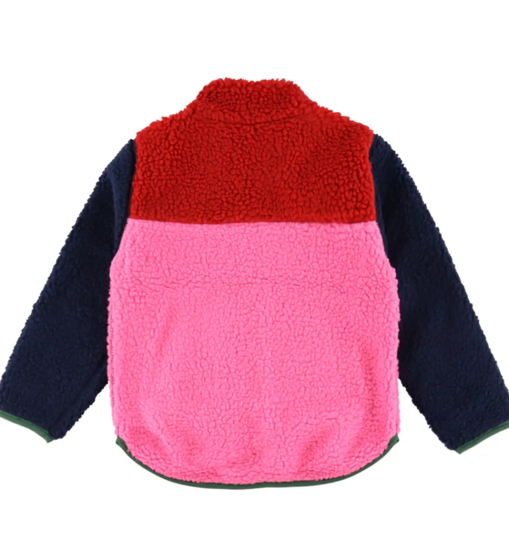 Skøn Danefæ fleecejakke i rød, pink og navyblå. Fleecejakken er lavet af teddyfleece med en høj krave og lange ærmer. Den lukkes foran med en gennemgående lynlås med hagebeskytter og indvendig vindstolpe. Fleecejakken har en lomme i hver side, og indvendigt er der glatvævet for.