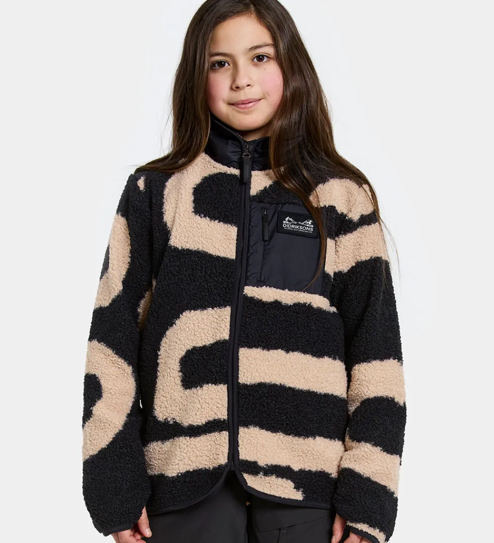 Lækker Didriksons fleecejakke i sort teddyfleece med et beigefarvet mønster af brede, snoede striber. Fleecejakken har en aftagelig hætte, som sidder fast med skjulte trykknapper, og den er lavet i en glatvævet kvalitet. Fleecejakken har smalle, elastiske kanter, og den åbnes med en skjult lynlås med hagebeskytter og indvendig vindstolpe. Ærmerne har et praktisk hul til tommelfingeren, og i venstre side sidder der en brystlomme, som lukkes med en lynlås.