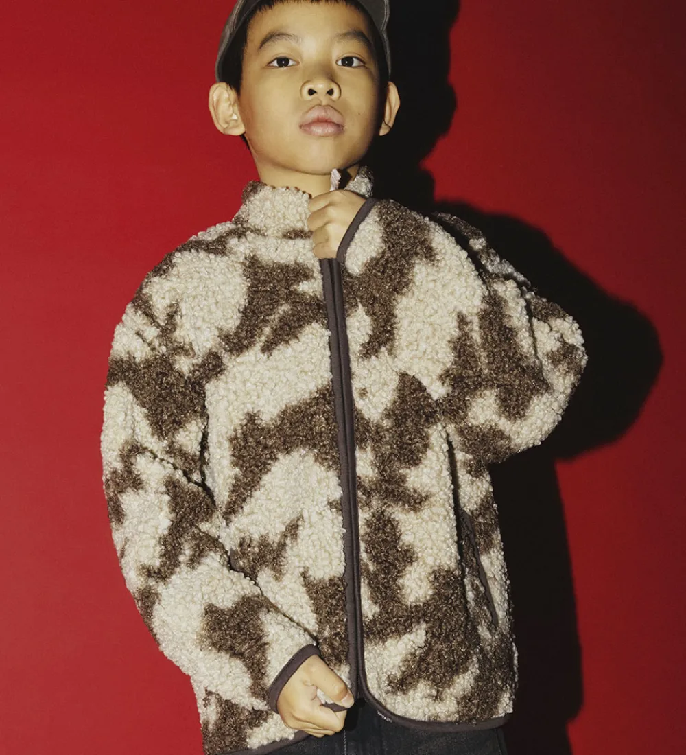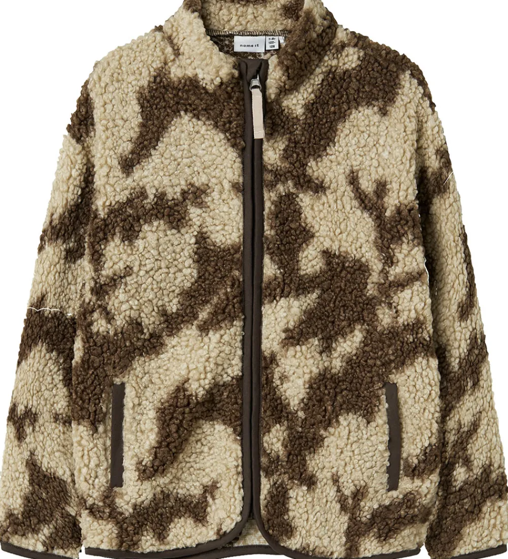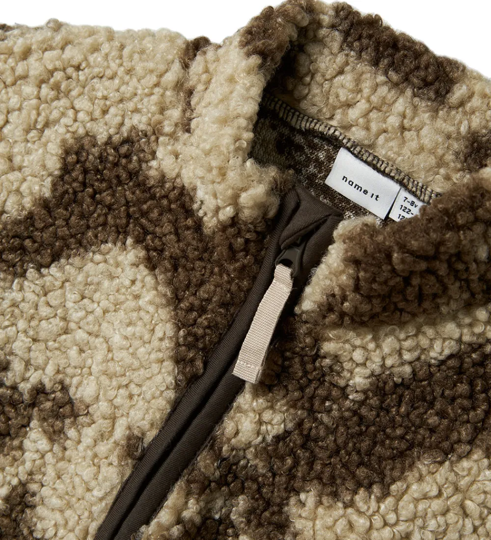 Moderne Name It fleecejakke med et smukt mønster i brune og beige nuancer. Fleecejakken er lavet af blødt teddyfleece, der giver et varmt og behageligt udtryk.