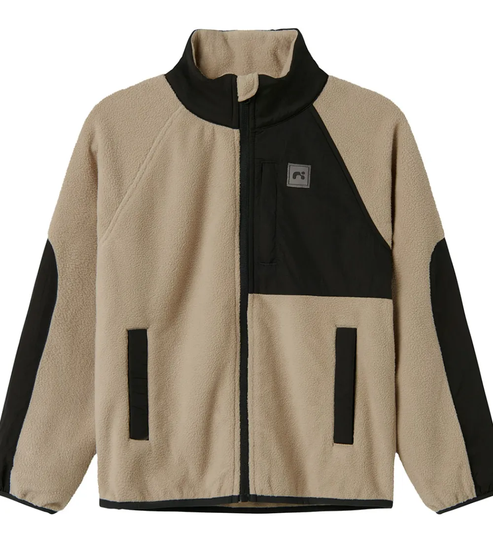 Lækker Name It fleecejakken i beige, fint fleece og med sorte, glatvævede detaljer.