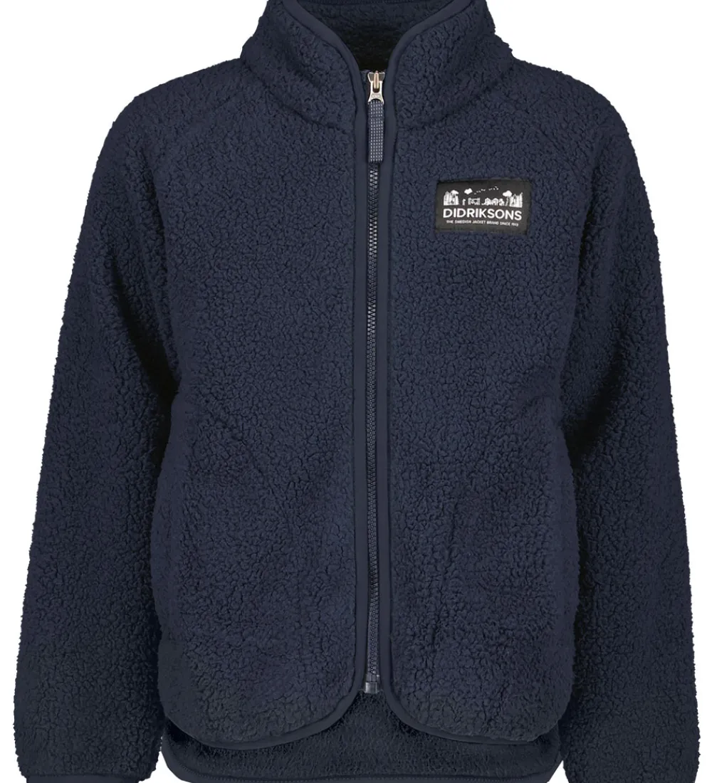 Dejlig Didriksons fleecejakke i navyblå teddy fleece med en sort og hvid logo-patch på venstre bryst.