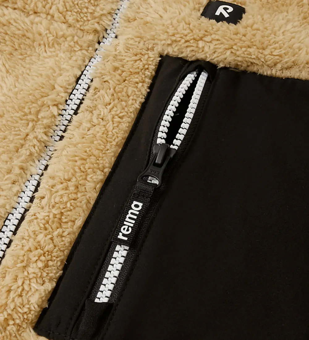 Lækker Reima fleecejakke i lysebrunt teddyfleece med en sort frontlomme samt sorte kanter.