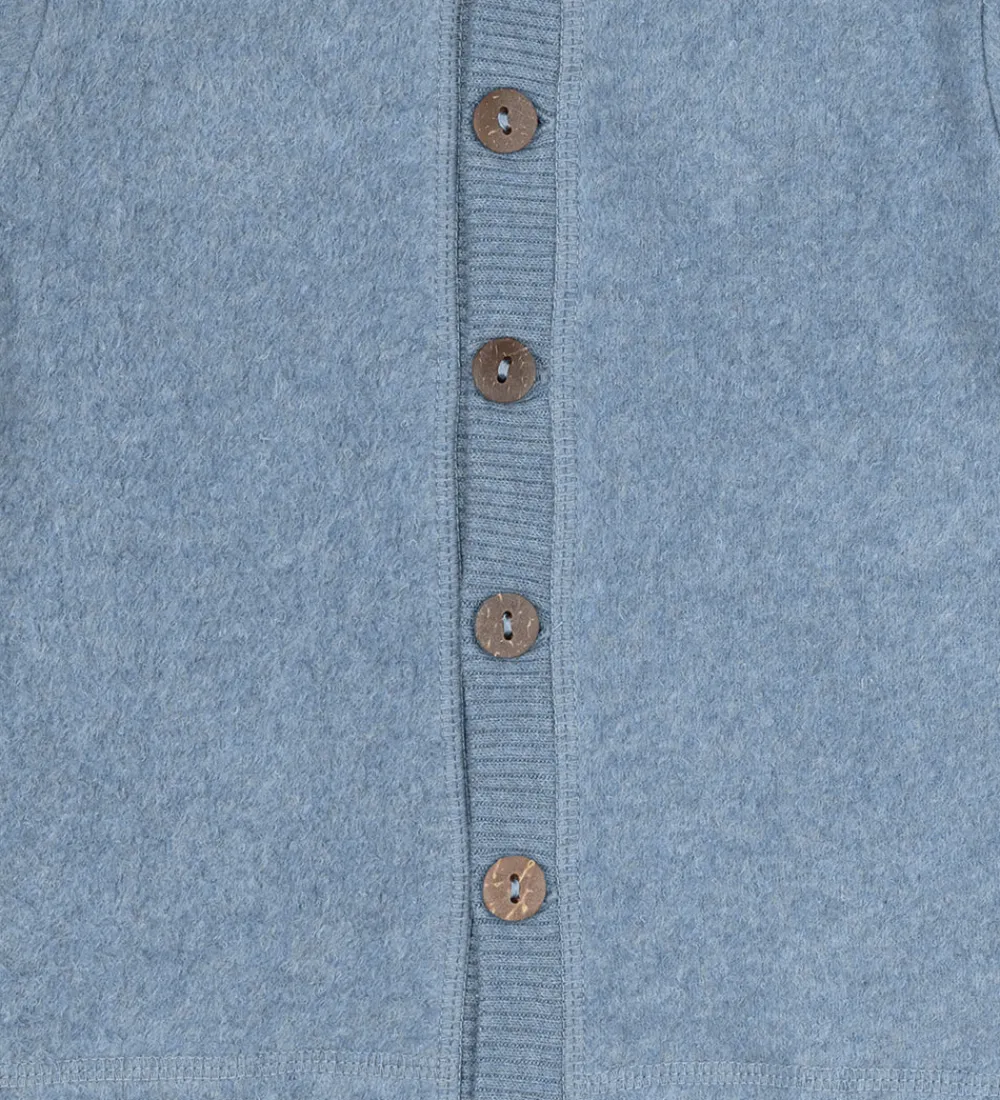 Lækker Mikk-Line fleecetrøje i en skøn blå farve med gennemgående brune knapper fortil. Fleecetrøjen har en blød, spids hætte og lange ærmer. Den har ribkanter i åbningen fortil samt i ærmerne. Fleecetrøjen har en lomme i hver side og er fremstillet i en meget blød og lun kvalitet.