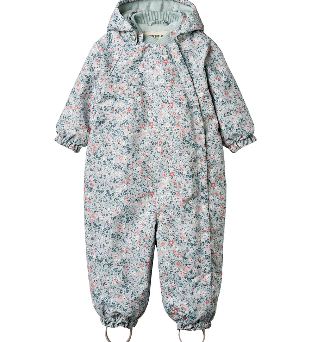 Sød Wheat flyverdragt i støvet, lys blå med et alloverblomsterprint i rosa, røde, hvide og blå farver. Flyverdragten rummer også både reflekspipings og -print.