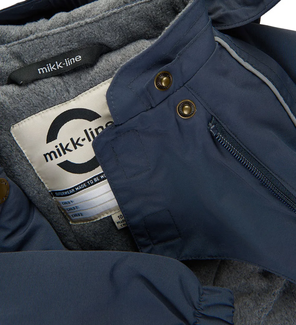 Mikk-Line flyverdragten åbnes fortil med to skrå lynlåse med dobbelt vindstolpe. Den inderste vindstolpe lukkes sammen med velcro i toppen, og den yderste vindstolpe lukkes til med trykknapper i toppen. Indvendigt er flyverdragten foret med blødt fleecefor i overkroppen, hætten og ved håndleddene, mens der er glatvævet for i resten af flyverdragten. Flyverdragten har en varm polyestervattering.