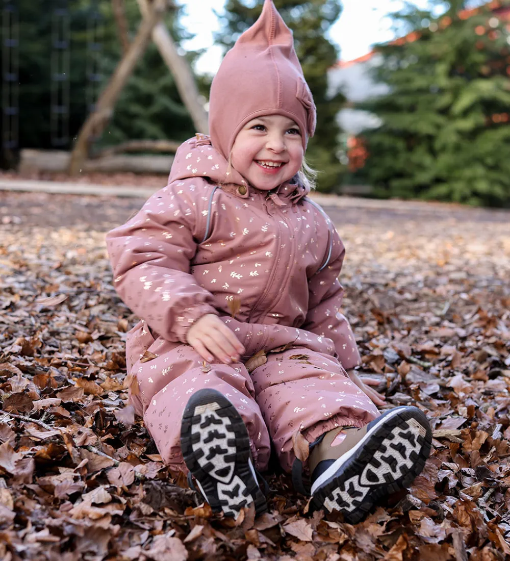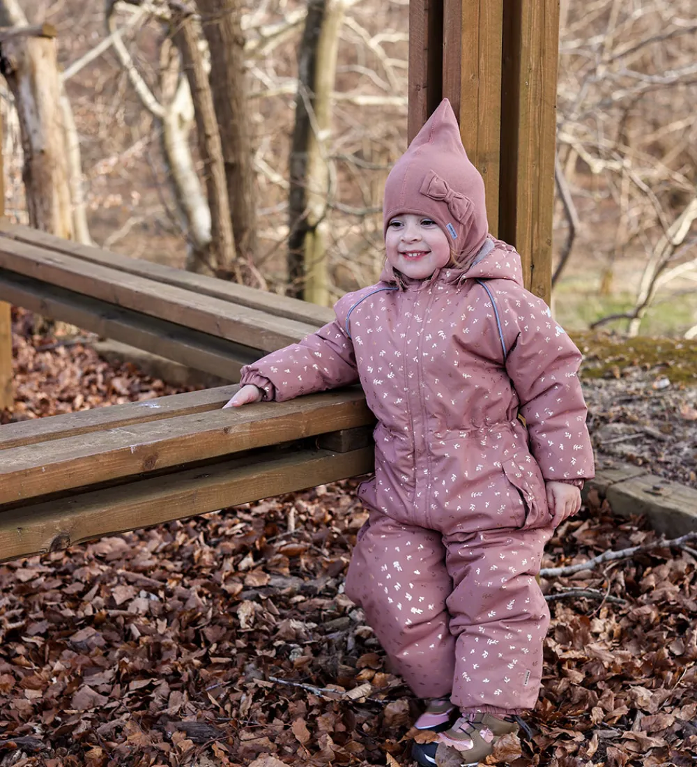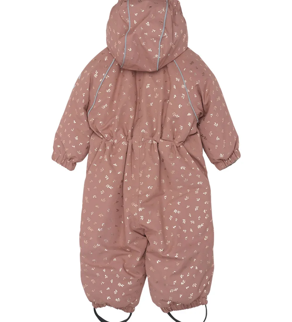 Fin Mikk-Line flyverdragt i rosa med et guldfarvet print med blade.