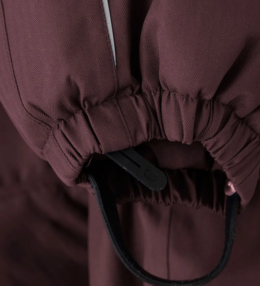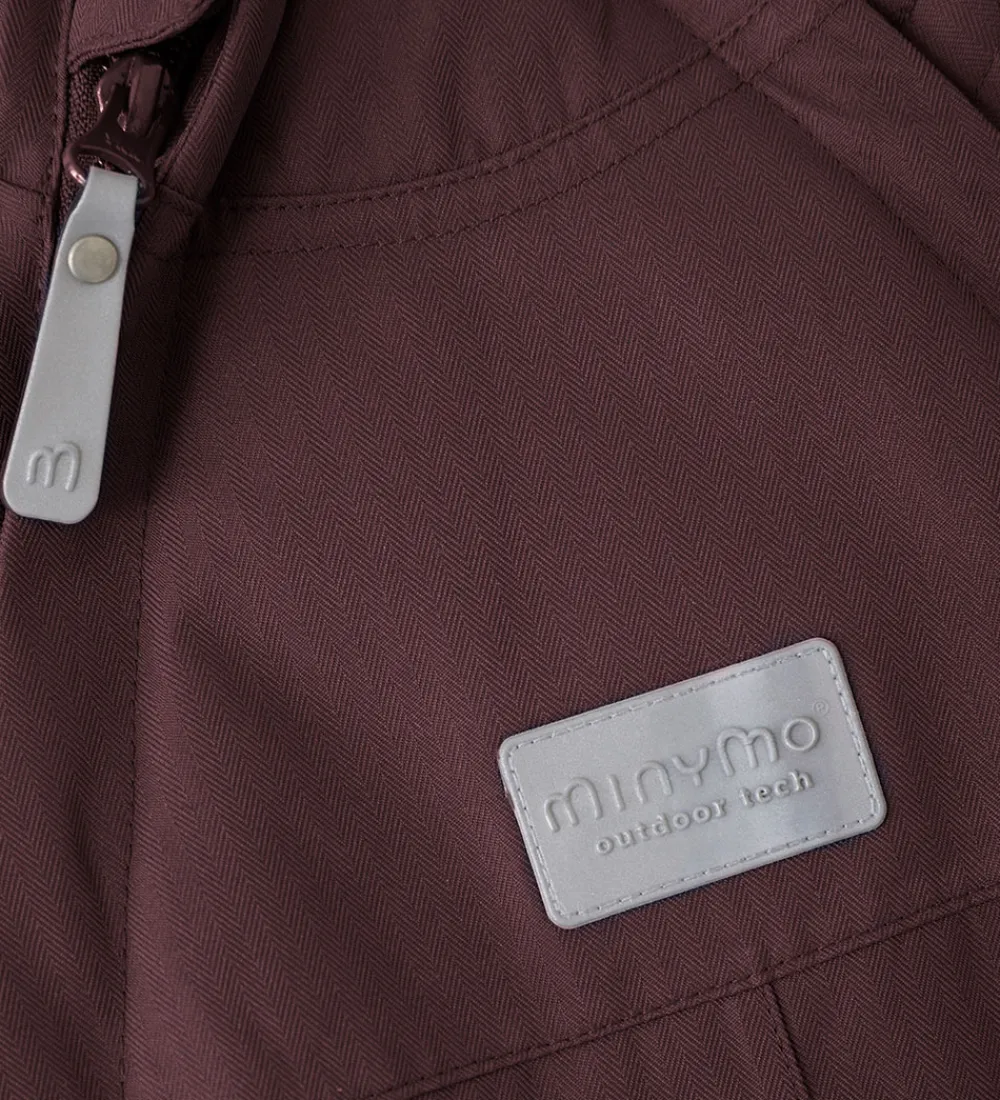 Dejlig Minymo flyverdragt i mørkelilla med flere velplacerede refleksapplikationer og -detaljer.