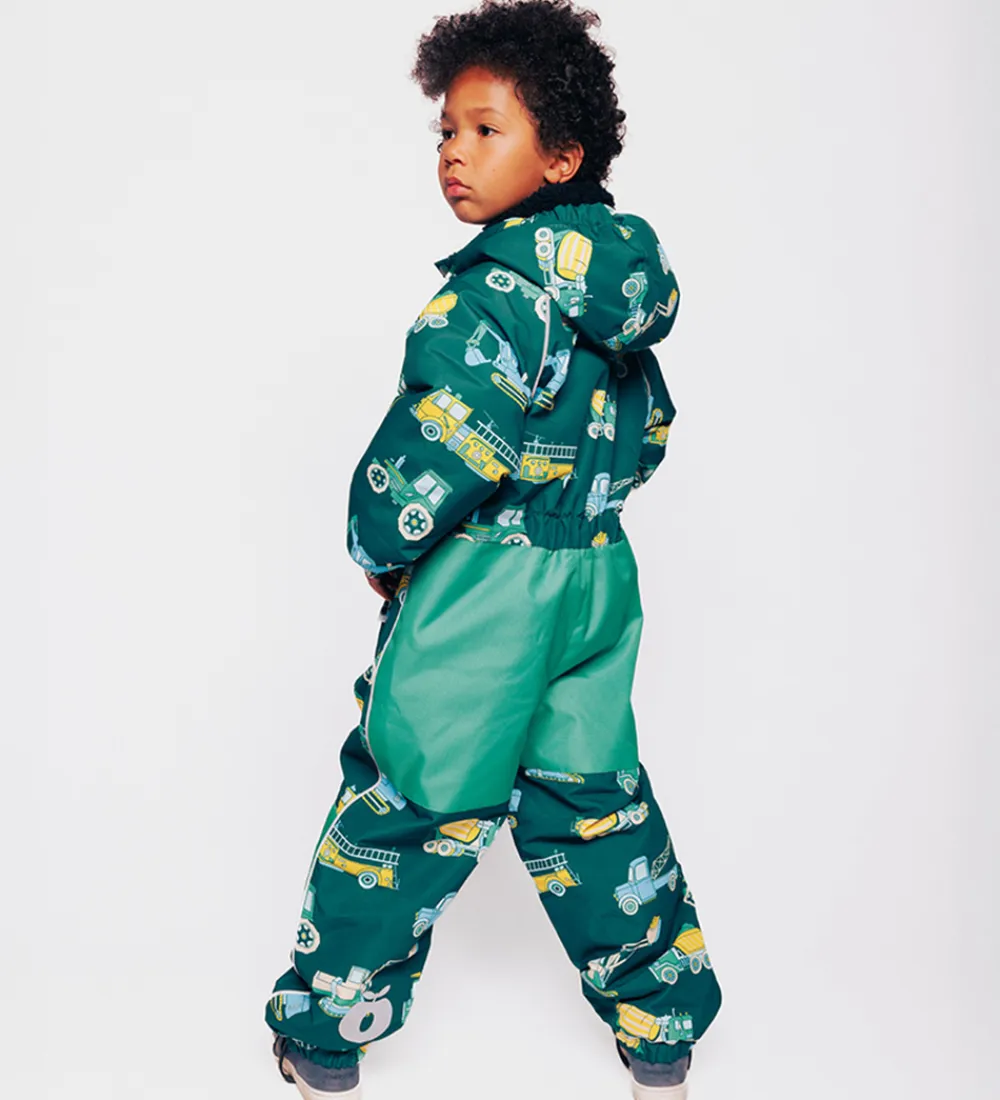 Skøn Småfolk flyverdragt i mørkegrøn med et alloverprint af farverige arbejdsbiler. Flyverdragten har lysegrønne forstrækninger og praktiske refleksdetaljer.