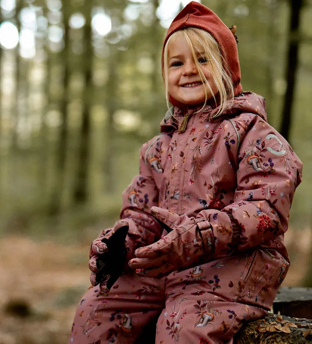 Fin Mikk-Line flyverdragt i rosa med efterårsprint af blomster, svampe og insekser. Flyverdragten har refleksdetaljer langs skuldrene, på venstre ærmer og på hætten.