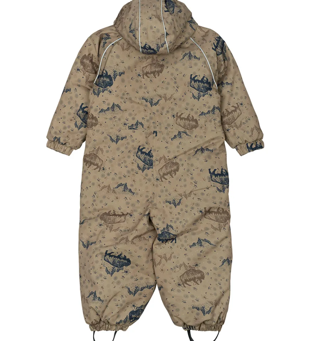 Fin Mikk-Line flyverdragt i støvetgrøn med et alloverprint med bl.a. bisonokser og klippeformationer brune og blå farver. Flyverdragten har refleksdetaljer langs skuldrene, på venstre ærmer og på hætten.