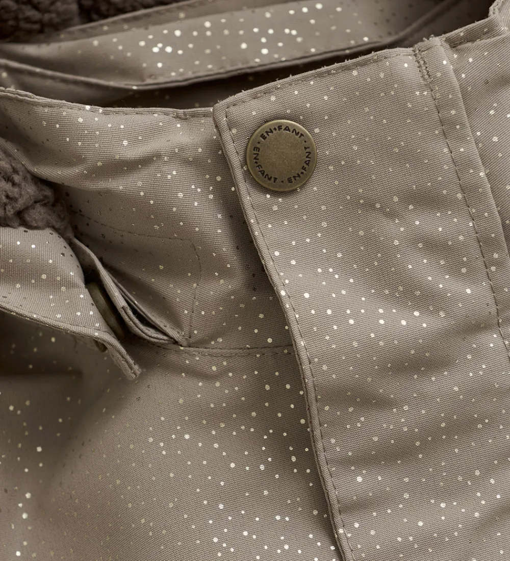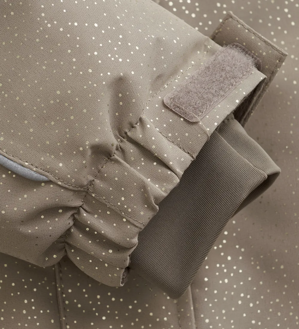 Pæn En Fant flyverdragt i beige med et allovermønster af skinnende guldprikker. Flyverdragten er med refleksprint og -pipings og har flotte flæser over skuldrene.