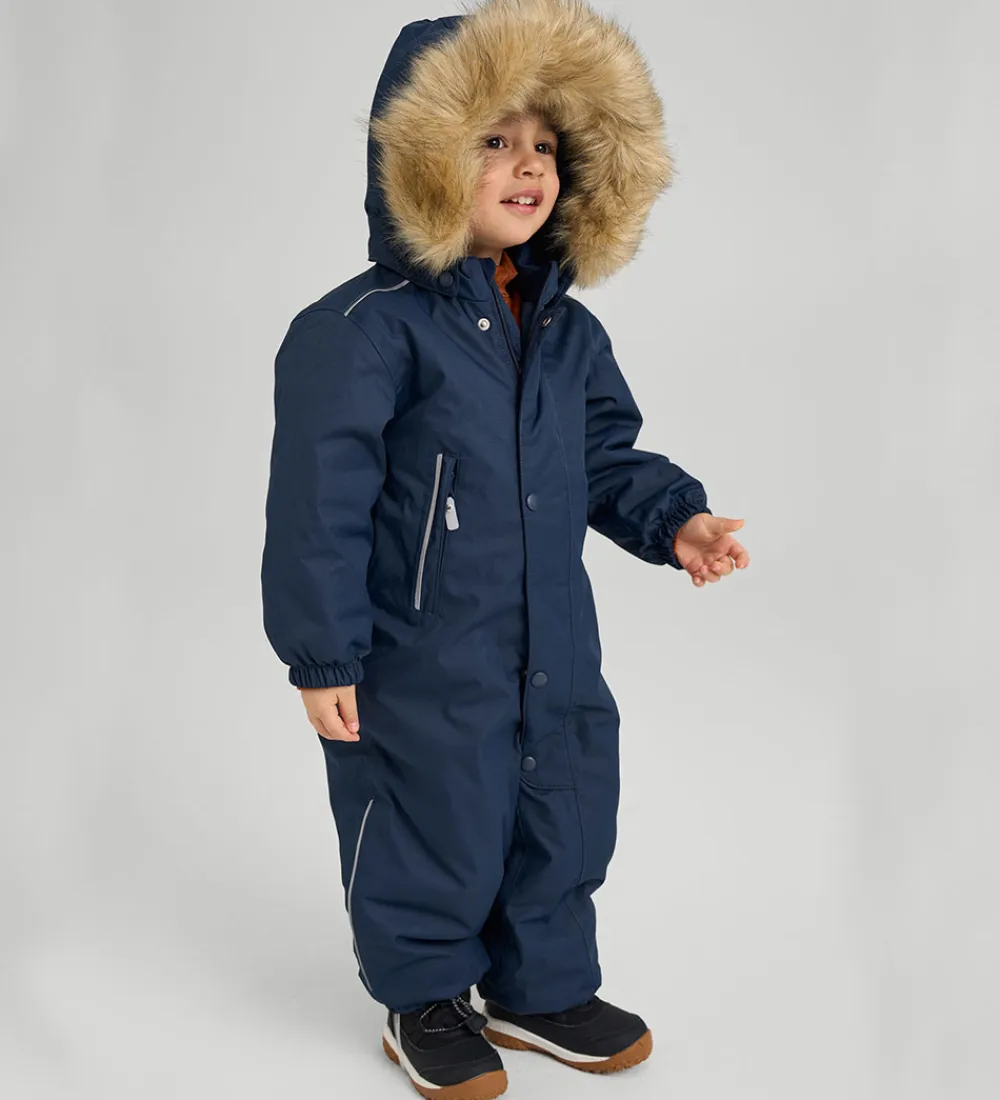 Flot Reima flyverdragt i ensfarvet navyblå, og hætten har en flot kant af imiteret pels.