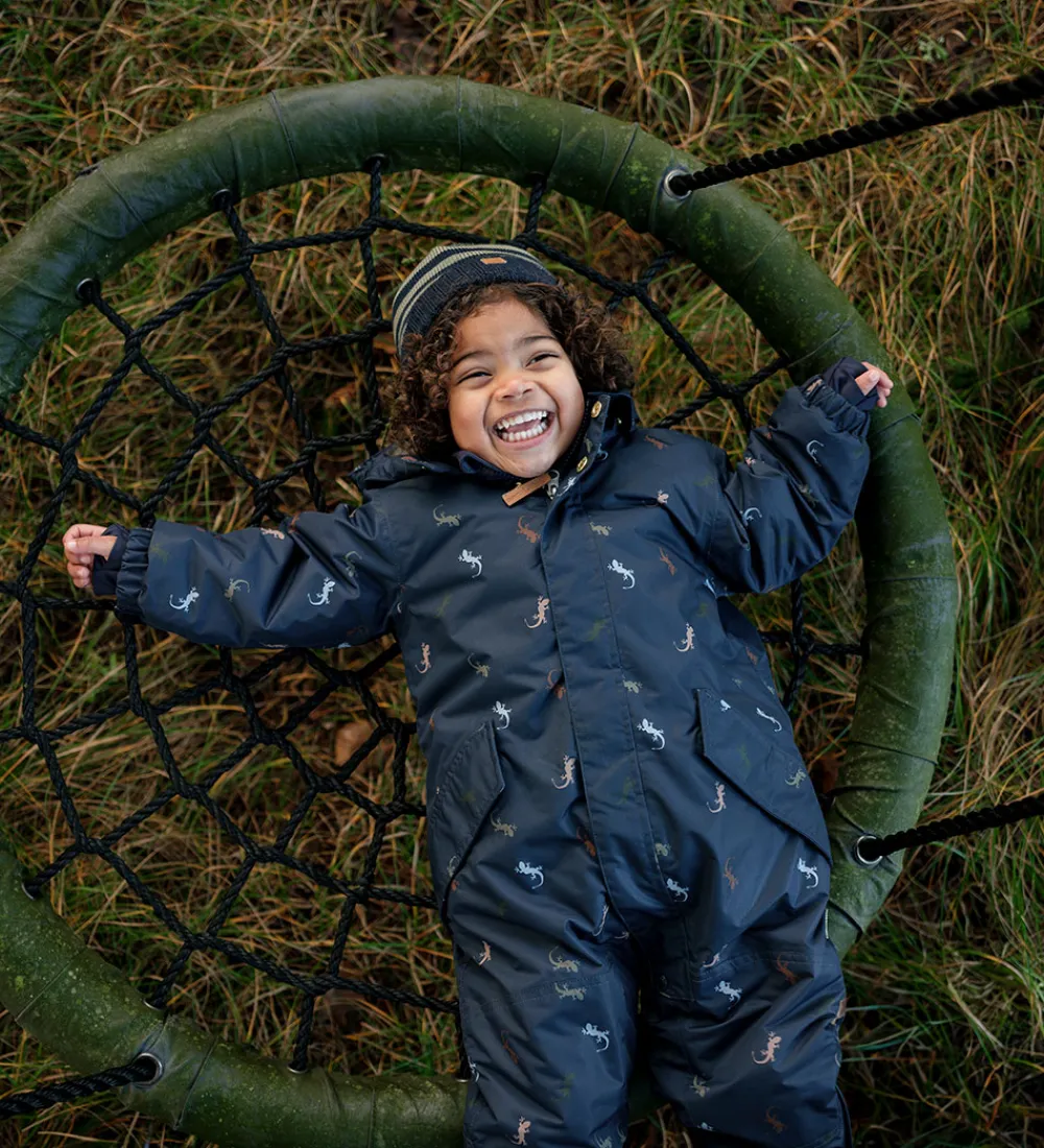Pæn Hust and Claire flyverdragt i navy med alloverprint af firben i forskellige afdæmpede farver. Flyverdragten har praktiske reflekspipings.