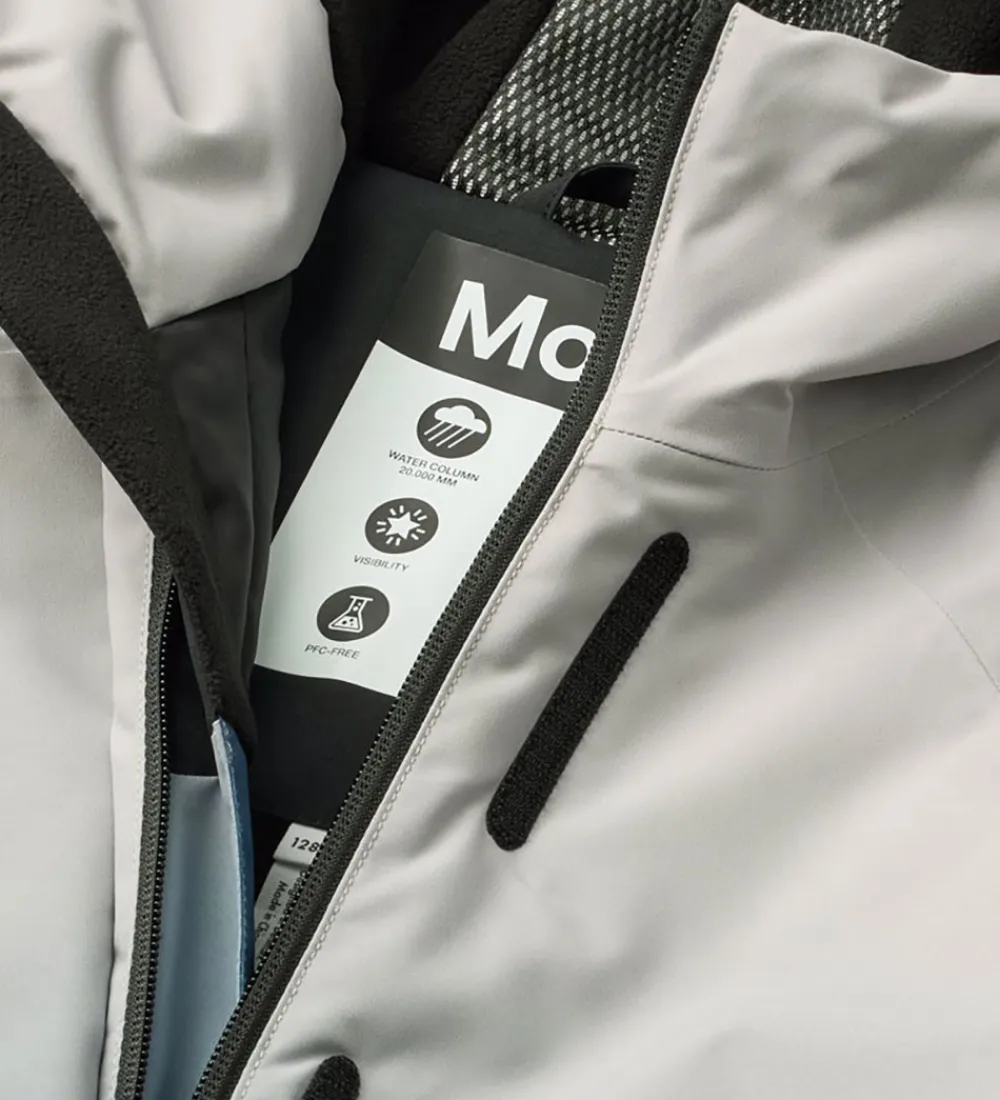 Molo flyerdragten har en fast hætte med en indvendigt elastikkant i enasigtsåbningen og skygge i toppen, som skærmer for vind og vejr. Ærmerne har praktiske snefang med et lille hul til tommelfingeren, og kanterne strammes ind med velcro. Buksebenene har også snefang med elastikkanter og indvendig gummibelægning og kan knappes op med en trykknap. Det yderste lag af buksebenene kan justers med velcro, og der er praktiske, justerbare gummistropper til at sætte under støvlerne.