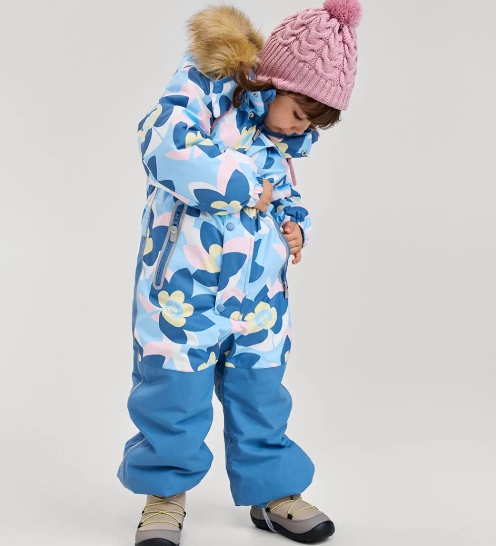 Fin Reima flyverdragt i blå med et farverigt blomsterprint i blå, lyserød og gul. Flyverdragten er forsynet med praktiske refleksdetaljer, og hætten har en flot kant af imiteret pels.