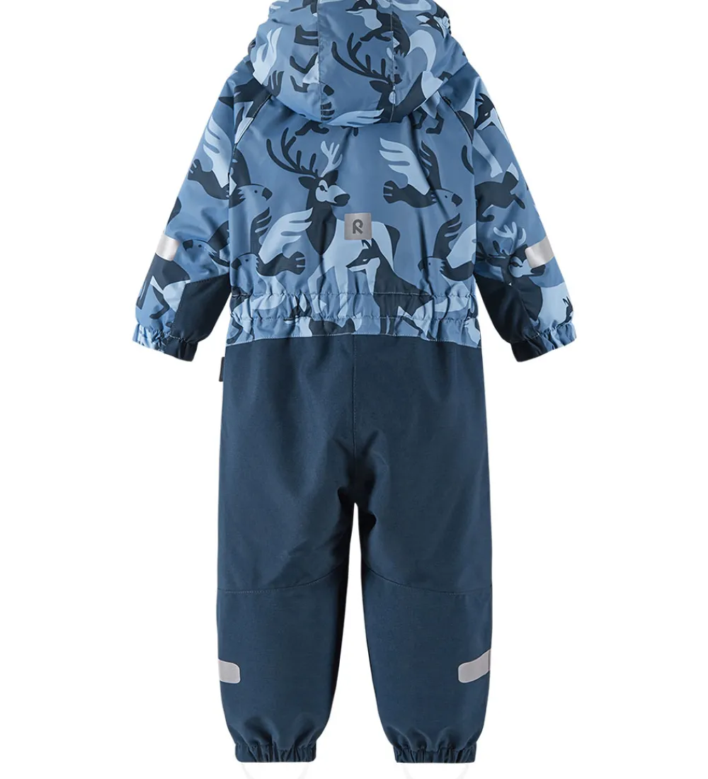 Skøn Reima flyverdragt i blå nuancer og med dyreprint.