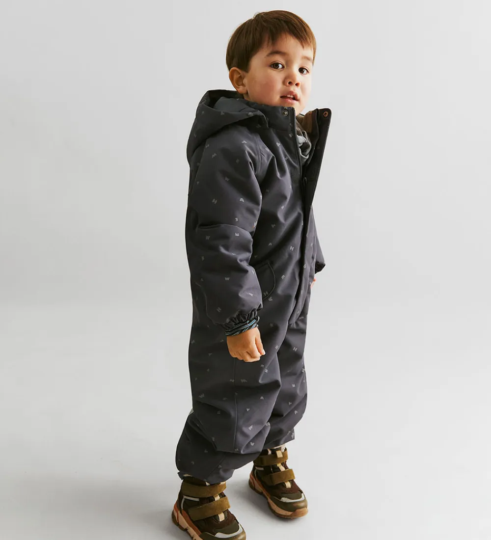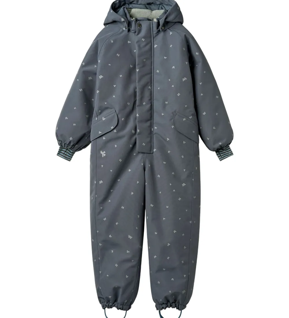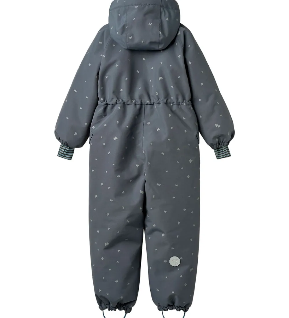 Skøn Wheat flyverdragt i gråblå med alloverprint af bogstaver fra brandets navn. Flyverdragten rummer også både reflekspipings og -print.