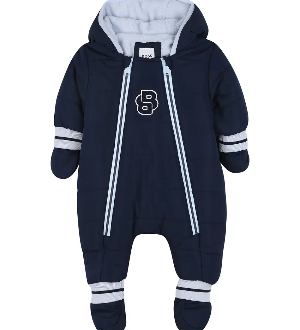 Smart BOSS flyverdragt i mørkeblå med lyseblå kanter med en smal, navy stribe, og fortil sidder der et mærke af navy frotté som former to B’er.