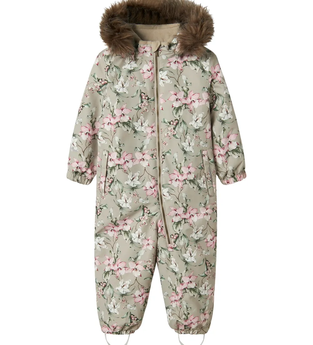 Name It flyverdragten lukkes fortil med en lynlås med hagebeskytter og indvendig vindstolpe. Indvendigt er der blødt fleecefor og glatvævet for. Flyverdragten er godt vatteret og har ekstra isolering ved bagdelen.