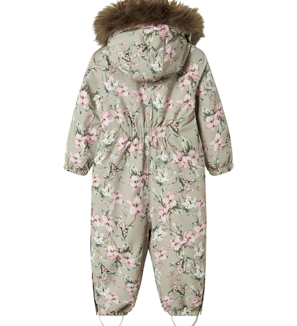 Skøn Name It flyverdragt i lysegrøn med et alloverprint af blomster i rosa, hvide og grønne nuancer. Flyverdragten har praktiske refleksdetaljer.