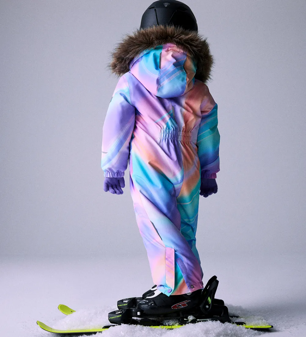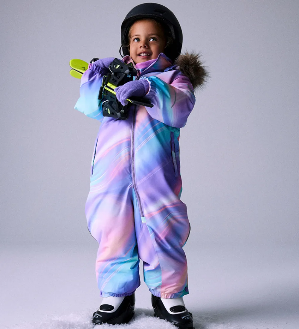 Name It flyverdragten har en aftagelig hætte, som sidder fast med skjulte trykknapper, og den har en flot kant af imiteret pels, som sidder fast med trykknapper. Hættens ansigtsåbning har en indvendig elastikkant af fleece. I siderne er der lommer, som lukkes med trykknapper. Ærmerne og benene har elastikkanter, og ved benåbningerne er der velcro og trykknapper samt aftagelige, justerbare gummistropper, som kan sættes under fodtøjet.