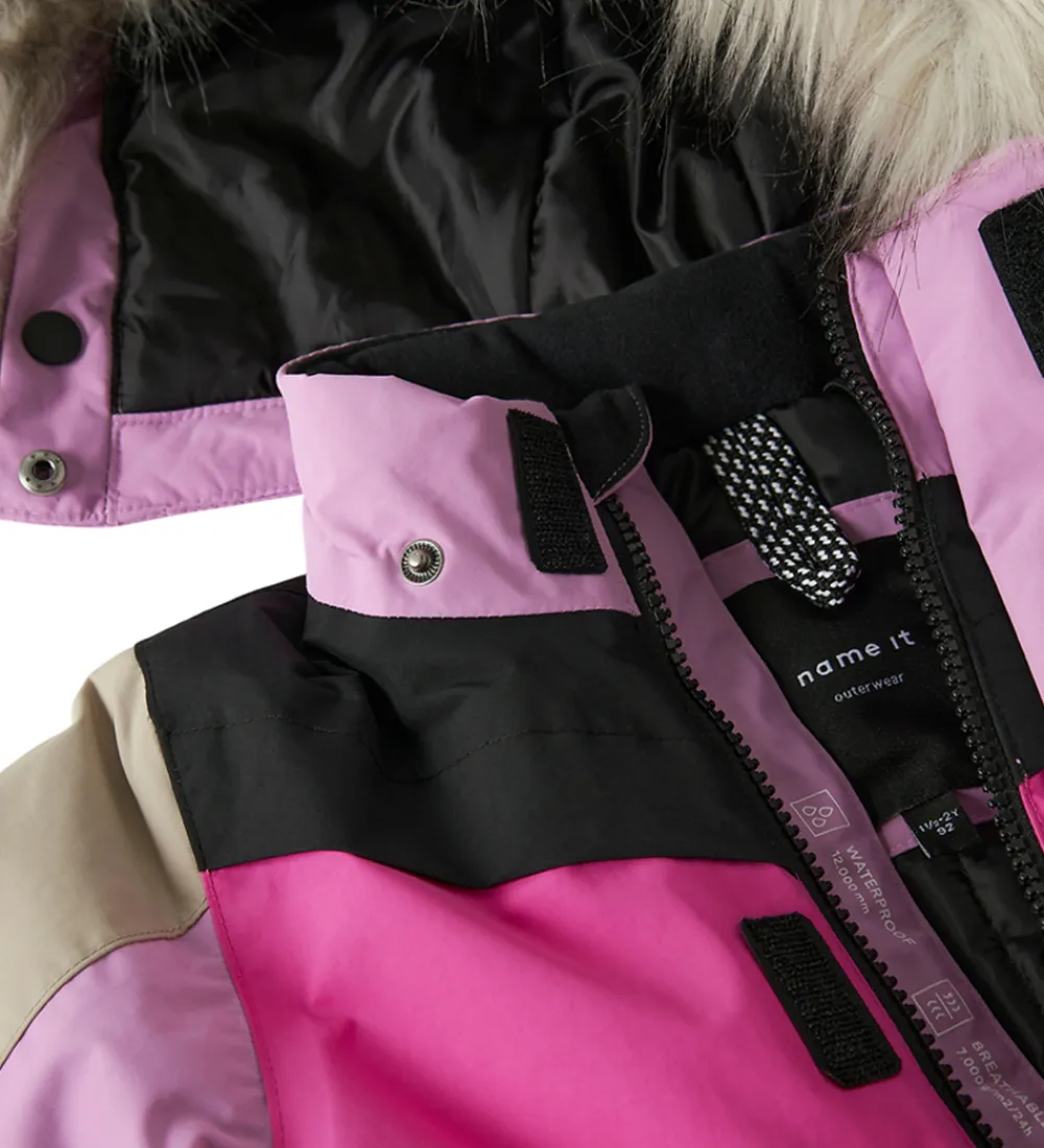 Smart Name It flyverdragt i pink, lilla, beige og sort.