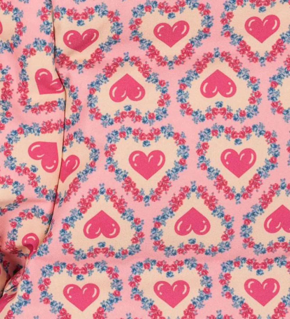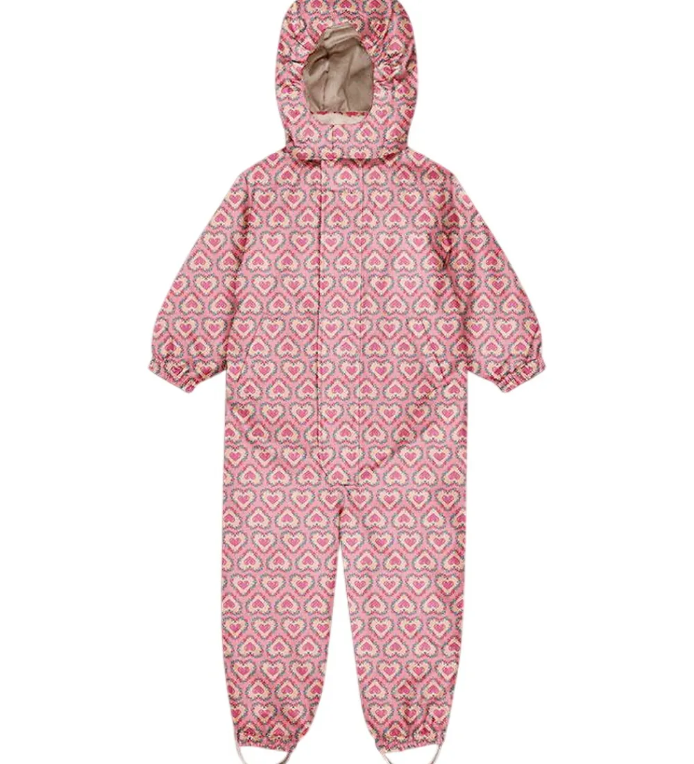 Fin Konges Sløjd flyverdragt i lyserosa med et alloverprint af hjerter og små blomster i blå, beige og rosa nuancer.
