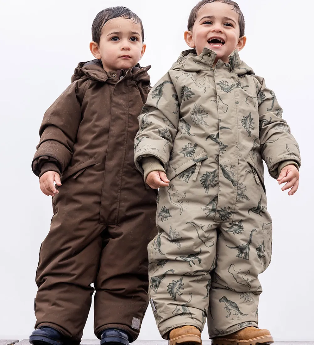 Skøn MarMar flyverdragt i mørkebrun med praktiske refleksdetaljer langs ærmerne og benene.