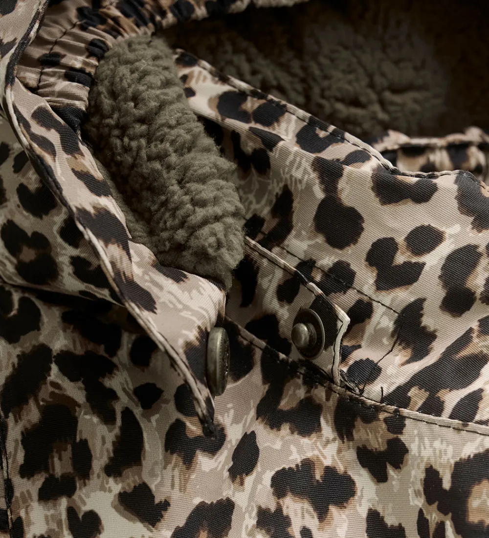Pæn En Fant flyverdragt med et leopardmønster i sort og beige. Flyverdragten er med refleksprint og -pipings og har flotte flæser over skuldrene.