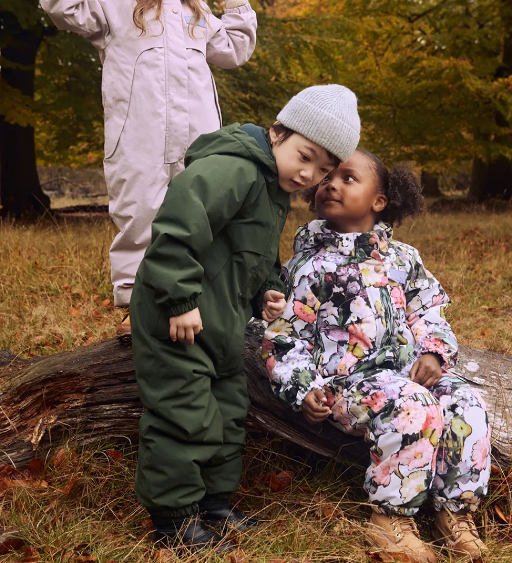 Flyverdragten er vatteret og foret med fleece i kraven, hagebeskytteren, armåbningerne, ryggen, numsen og knæene, mens resten af flyverdragten har et glatvævet for.