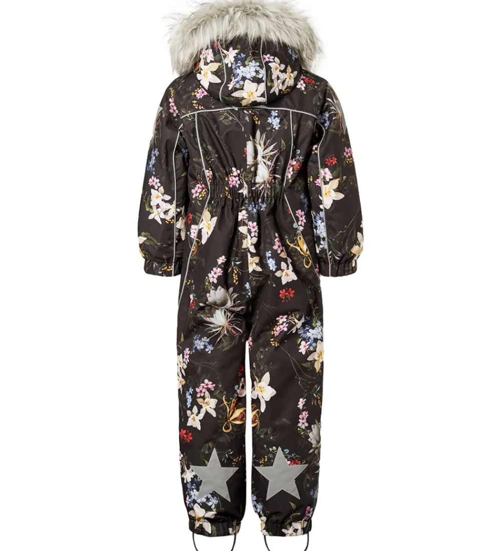 Smart Molo flyverdragt i sort med et smuk og farverigt alloverblomsterprint. Flyverdragten er udstyret med store stjernereflekser og reflekspipings.