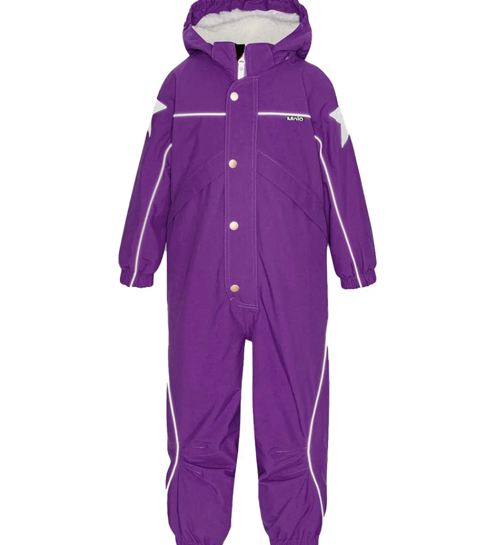 Lækker Molo flyverdragt i lilla. Flyverdragten er udstyret med store stjernereflekser og reflekspipings.