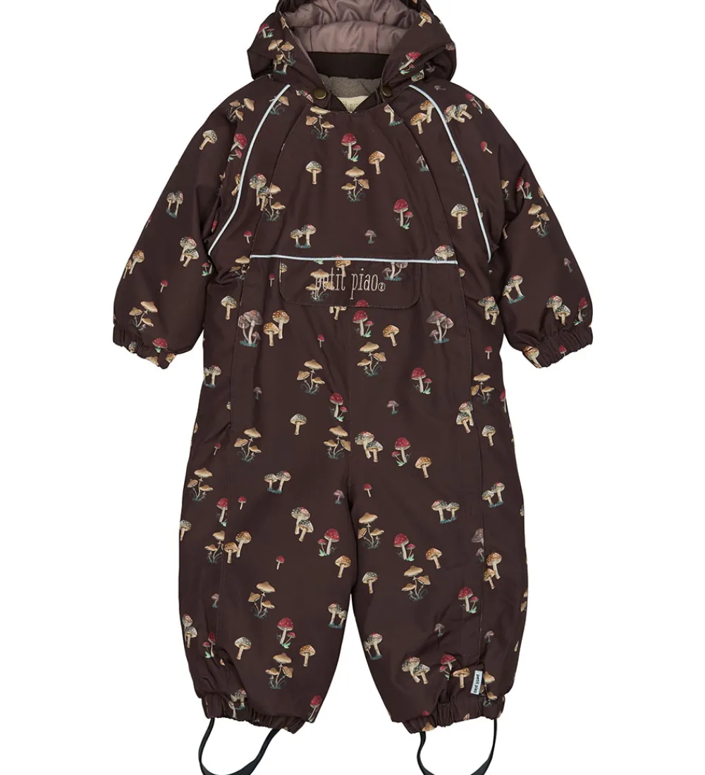 Skøn Petit Piao flyverdragt i brun med et alloverprint af svampe i afdæmpede farver. Flyverdragten er med praktiske reflekspipings og et broderet logo fortil.