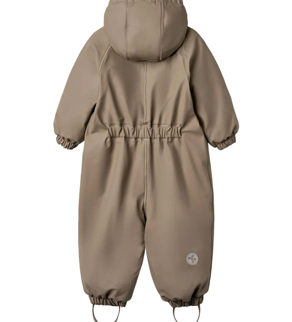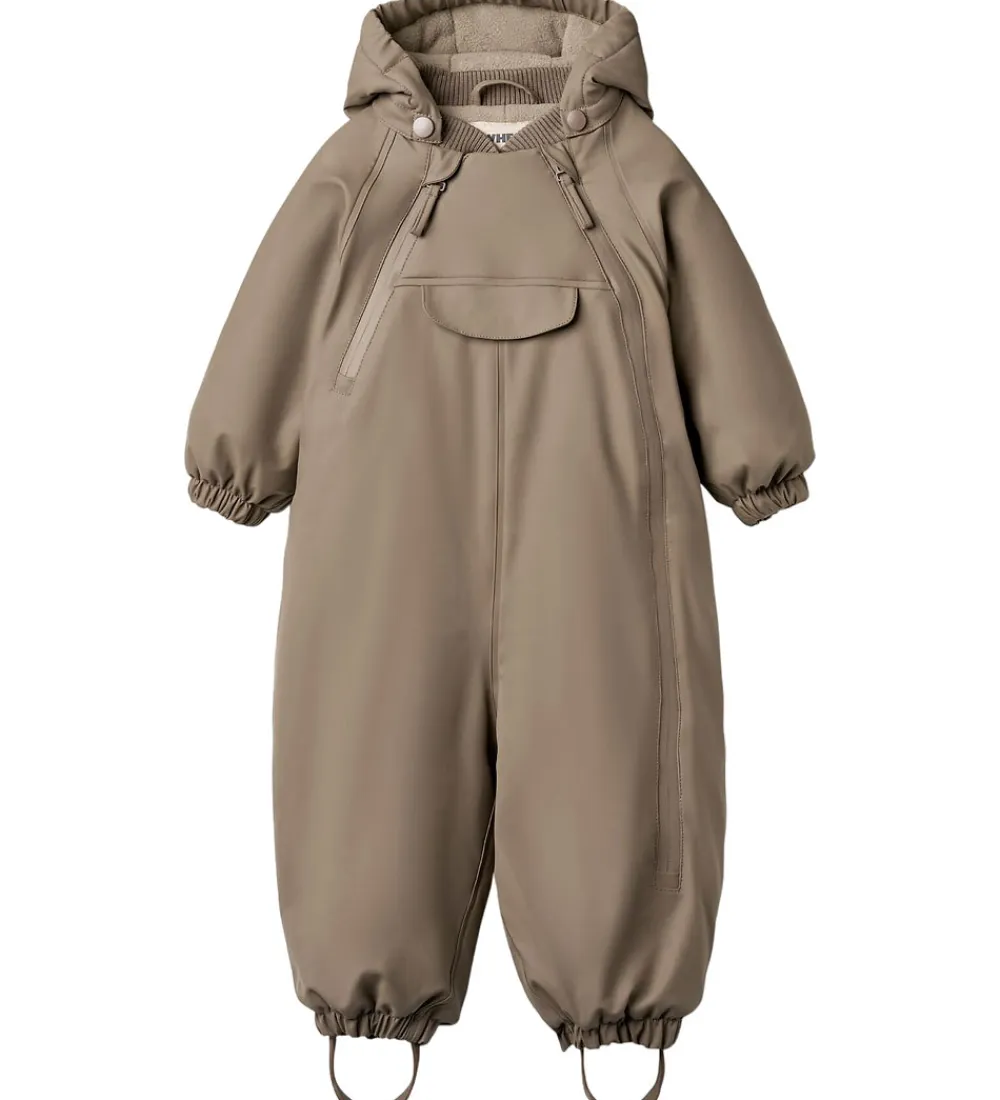 Wheat flyverdragten har to skrå lynlåsåbninger med dobbelt vindstolpe foran. Den ene lynlås kan åbnes fra hagen og hele vejen ned ad venstre bukseben. Lynlåsen i højre side kan åbnes til taljen. Indvendigt er der en lukning over brystet med velcro. Fortil er der en lille lomme, der åbnes med en trykknap. Flyverdragten har aftagelig hætte med trykknapper, og kan justeres med velcro på toppen. Den er med ribkrave, som er behagelig for barnet at have tæt på huden.