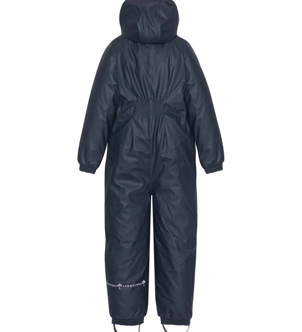 Flot Ver de Terre flyverdragt i ensfarvet navy med en vandtæt PU-overflade og med sorte lynlåse.
