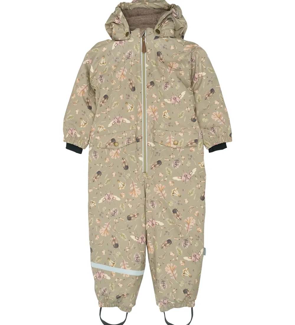 Fin Mikk-Line flyverdragt i støvet grønt PU med et efterårsprint med blade, kogler, agern og biller i brune og grønne nuancer.