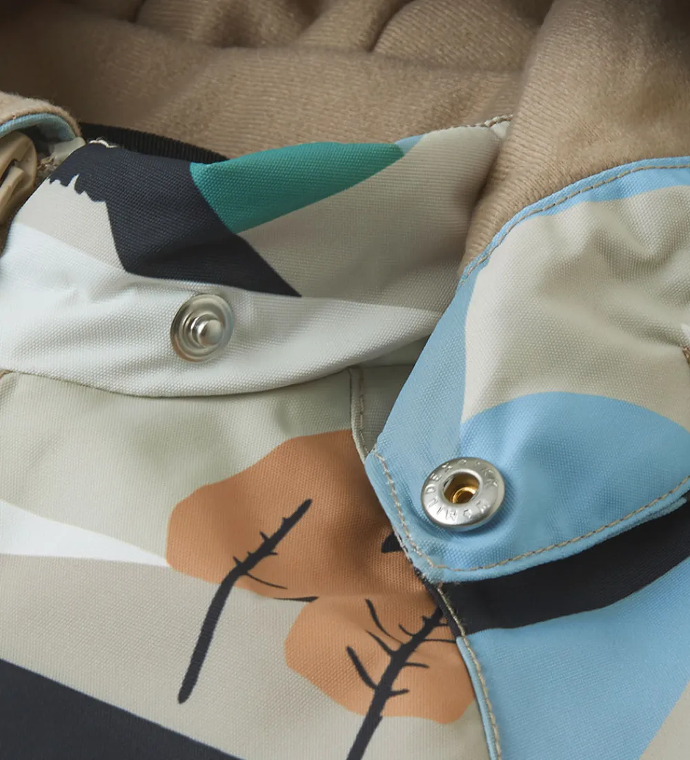 Skøn Reima flyverdragt med et unikt landskabsprint i nuancer af blå, beige og brun.