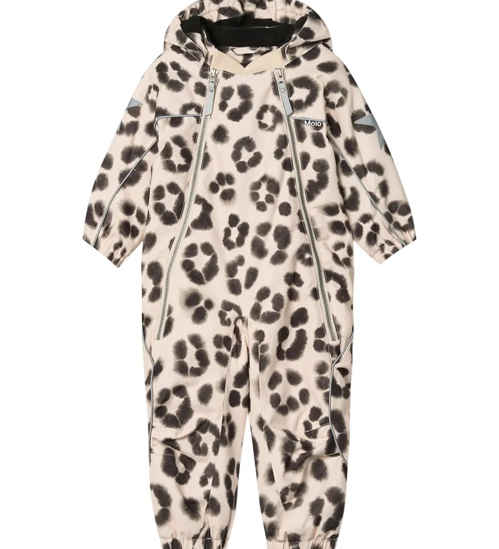 Flot Molo flyverdragt med et lyst allover-sneleopardprint. Flyverdragten er udstyret med store stjernereflekser og reflekspipings.