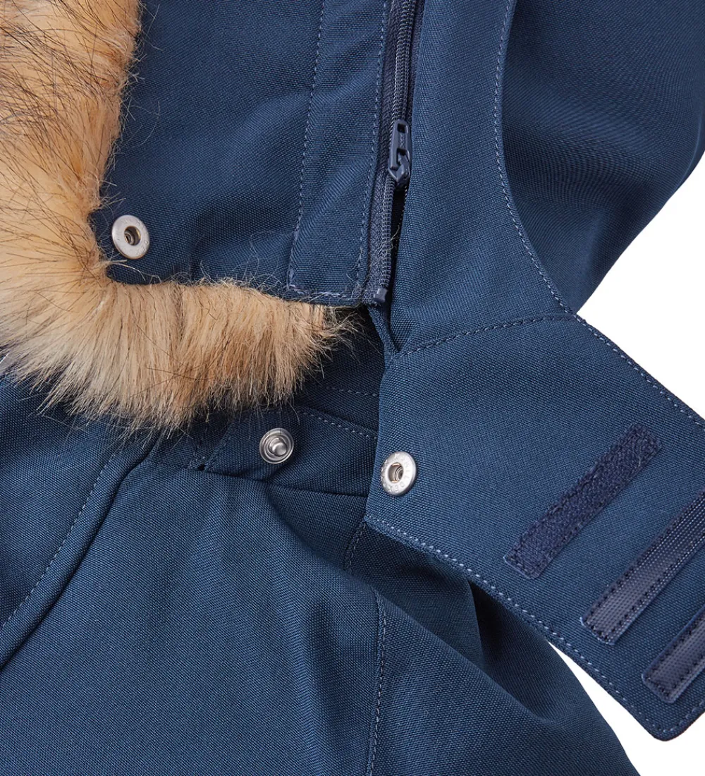Fin Reima flyverdragt i ensfarvet navyblå, og hætten har en flot kant af imiteret pels.