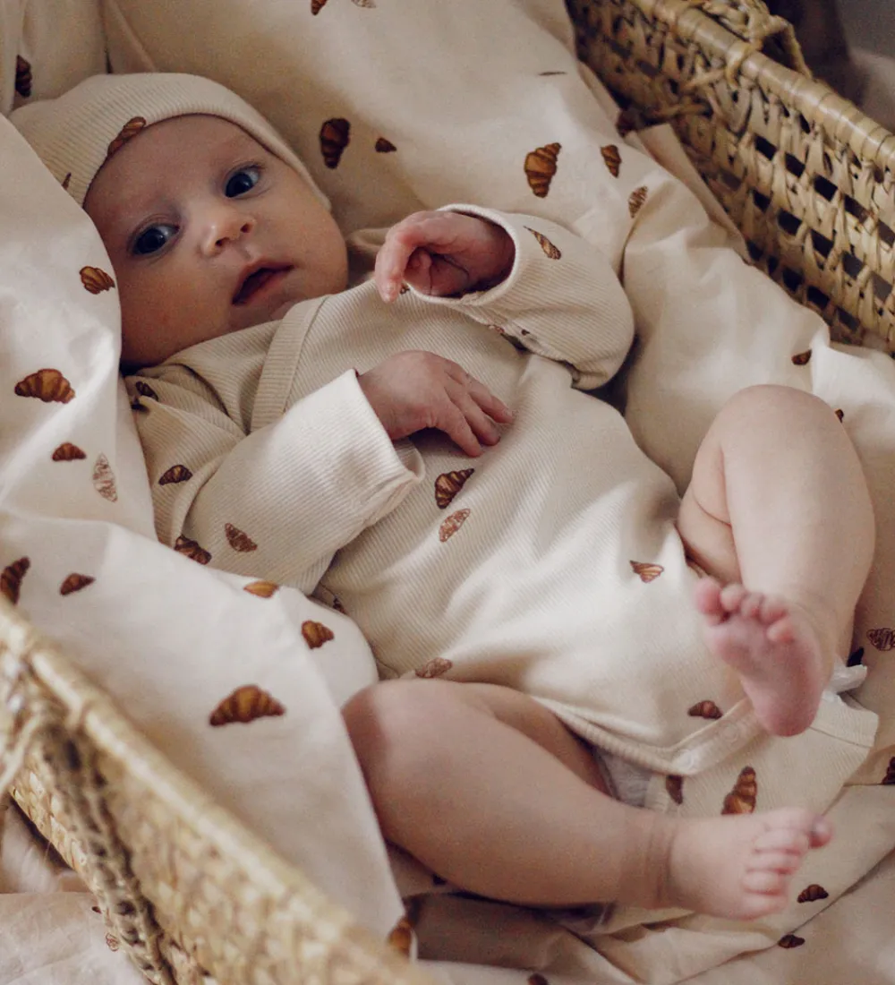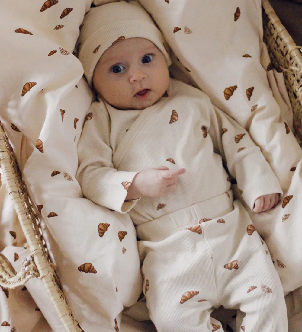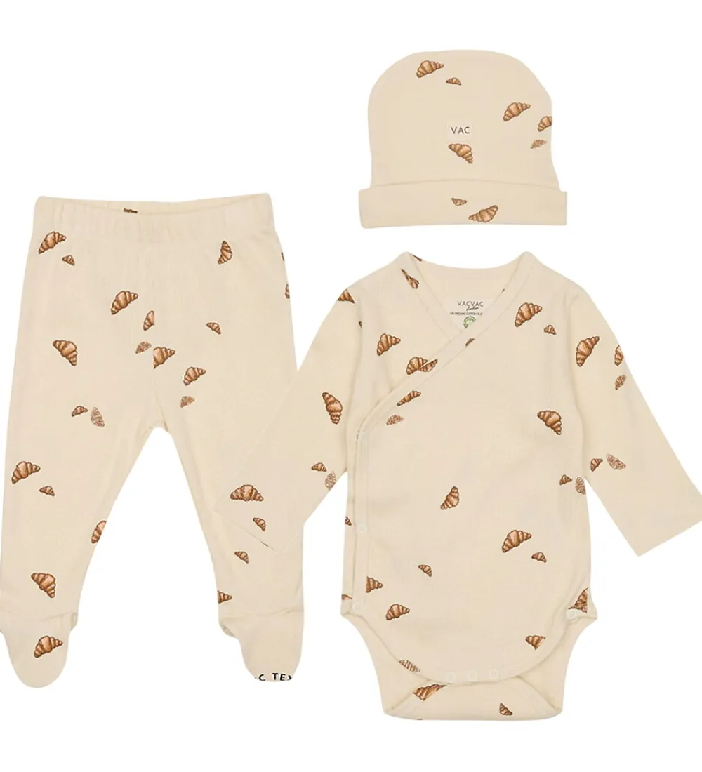 Charmerende VACVAC gaveæske, der indeholder en body, et par bukser og en hue i beige med et print med forskellige små croissanter i brune nuancer.