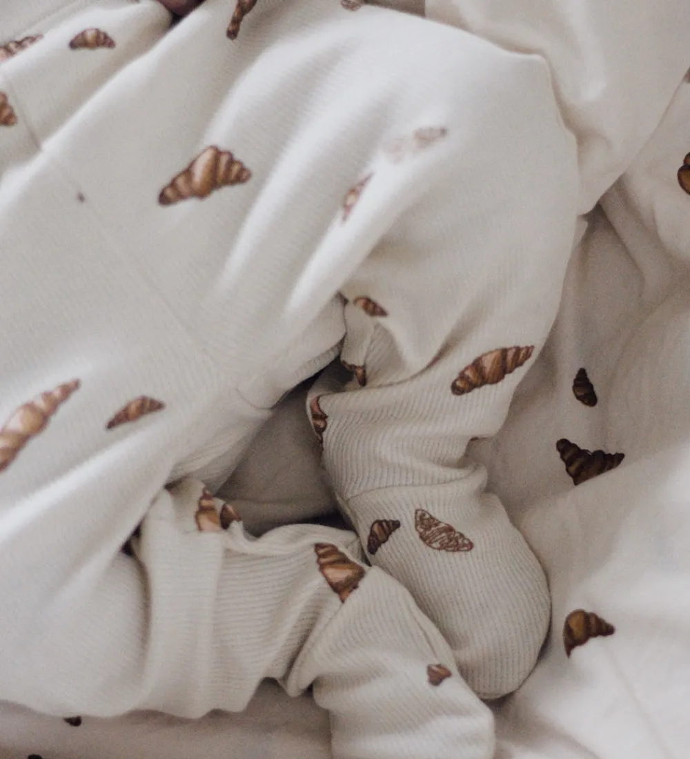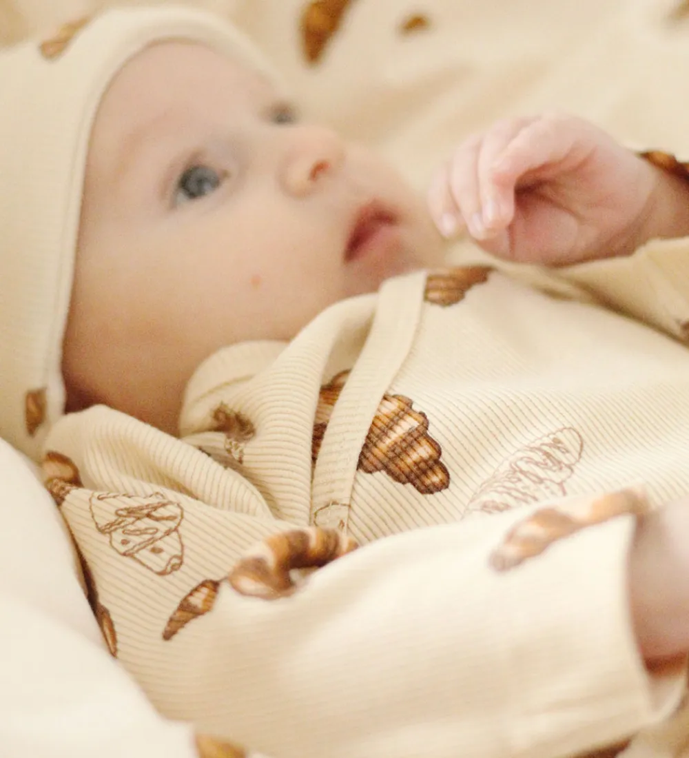 Flot VACVAC gaveæske, der indeholder en body, et par bukser og en hue i beige med et print med forskellige store croissanter i brune nuancer.