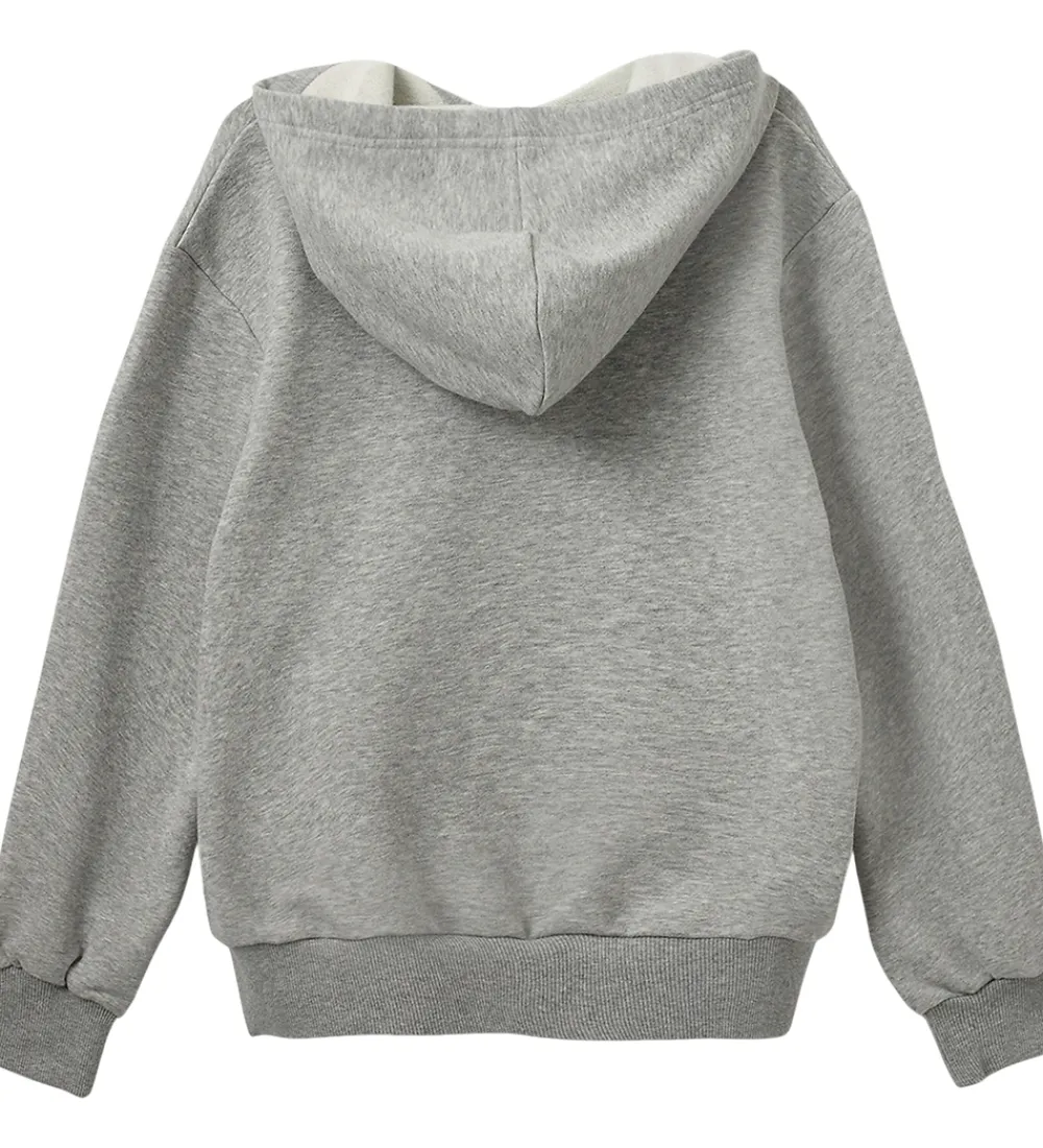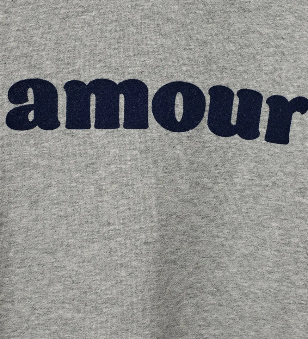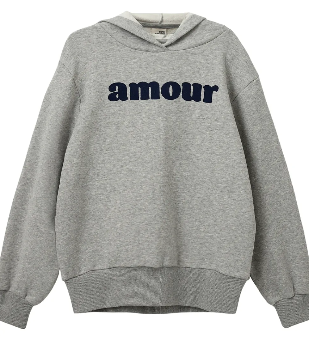 Elegant Sofie Schnoor hættetrøje i en meleret, lysegrå nuance med ordet “amour” i sort på fronten. Hættetrøjen har en rummelig hætte samt ribkanter ved ærmerne og i livet.