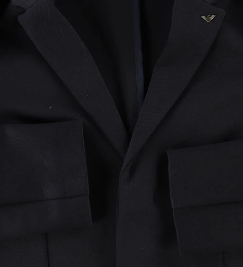 Emporio Armani habitjakken lukkes med to skjulte knapper, og den har to store lommer fortil. Bagpå har jakken to korte slidser.