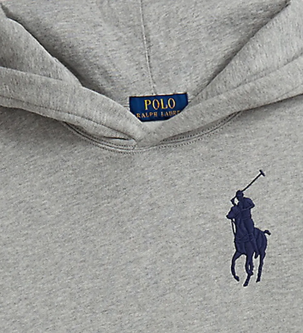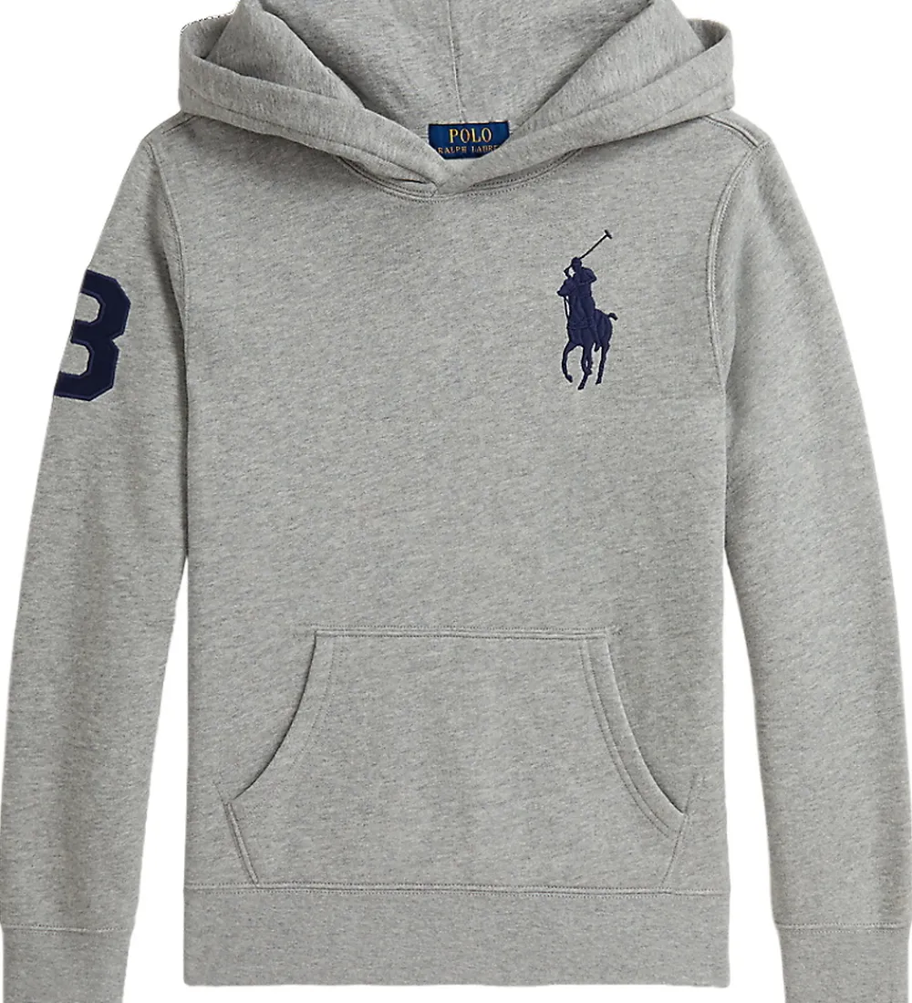 Stilfuld hættetrøje fra Polo Ralph Lauren i en gråmeleret sweat. Hættetrøjen har et markant, mørkeblåt Polo Ralph Lauren logo på brystet samt tallet “3” på ærmet. Hættetrøjen er designet med en praktisk kængurulomme og ribbet kanter, og på indersiden er der blødt, børstet bomuld.