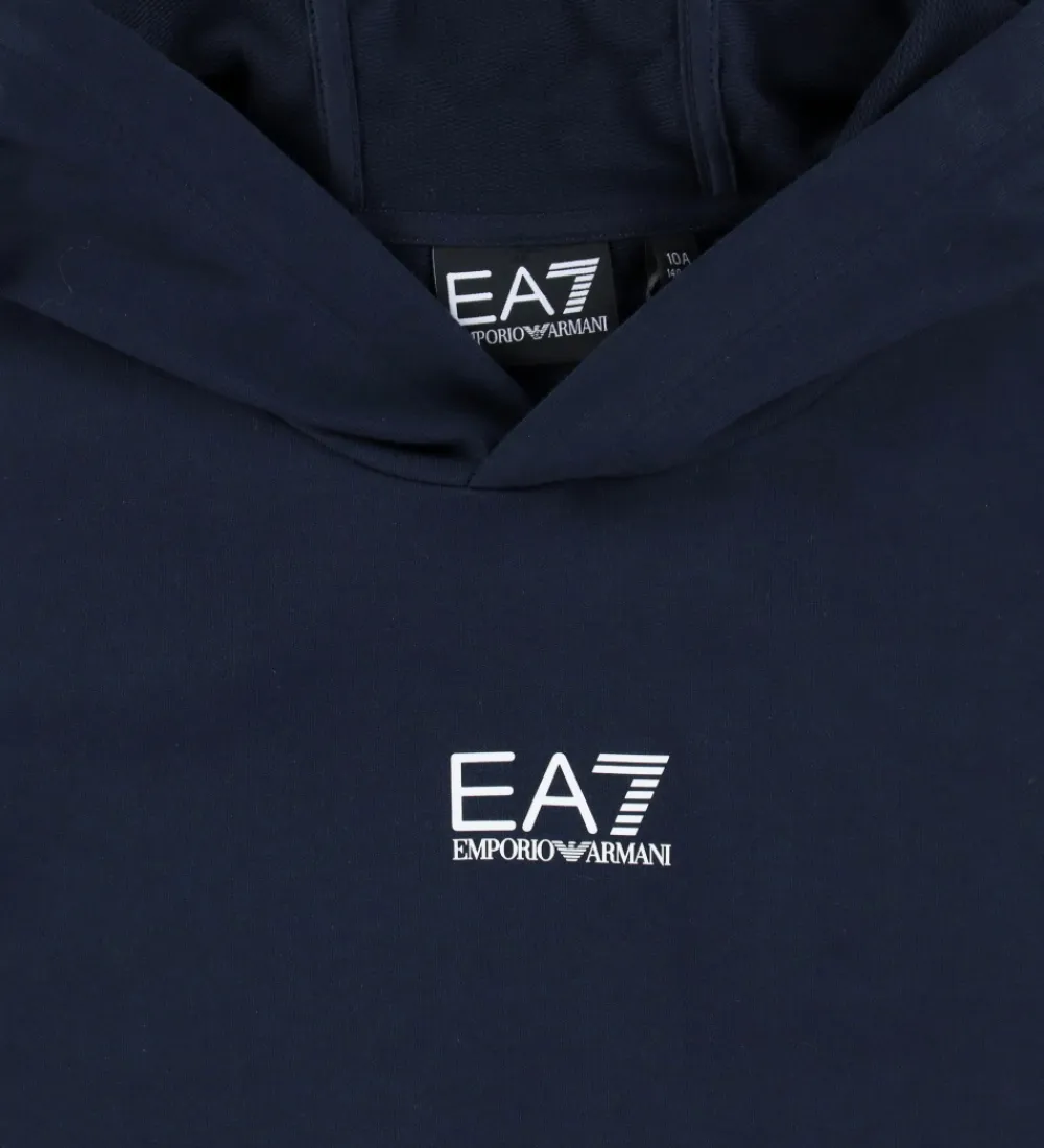 Flot EA7 hættetrøje i navy sweat, og fortil er der trykt et lille, hvidt logo.