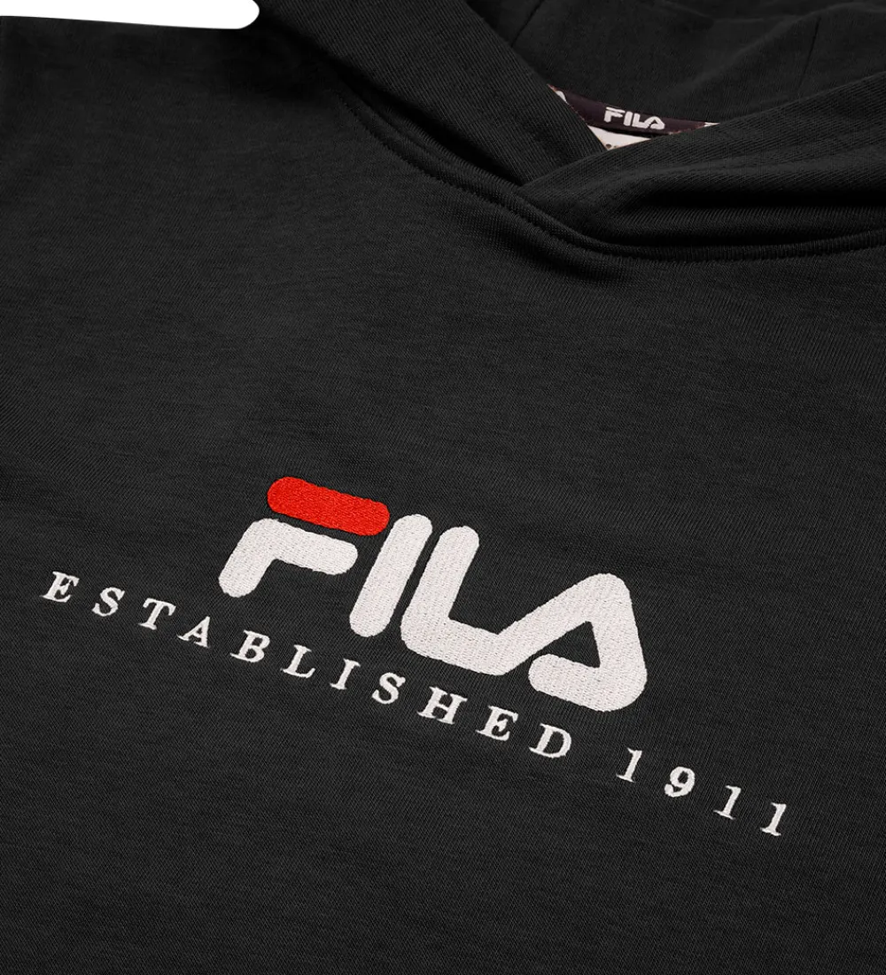 Stilfuld Fila hættetrøje i en klassisk, sort farve med et markant Fila-logo broderet på brystet i hvid og rød. Hættetrøjen har en praktisk kængurulomme foran og en blød ribkant ved håndleddene og i bunden, som giver en god pasform.