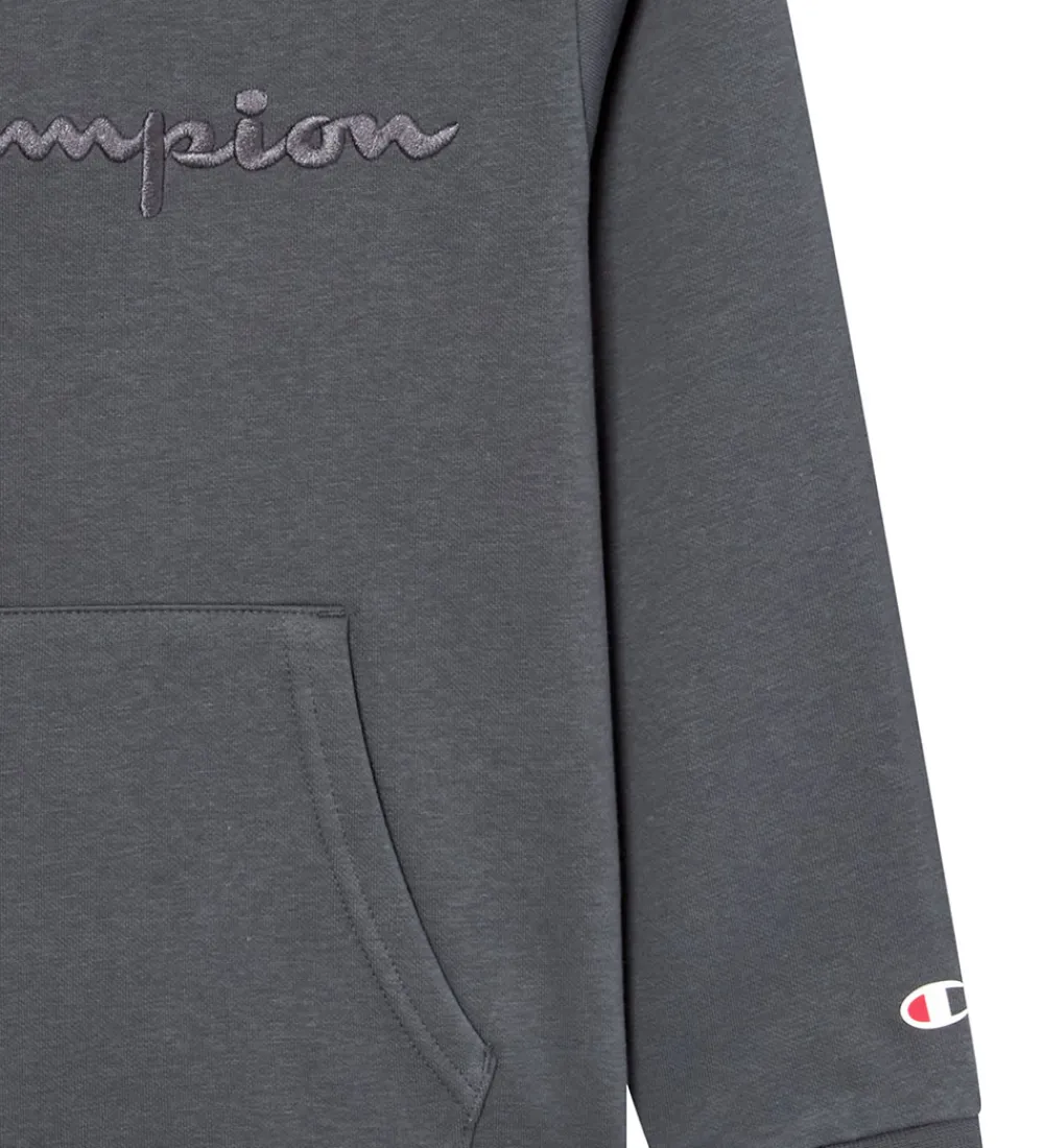 Flot hættetrøje fra Champion i grå med et diskret logo broderet på brystet. Champion hættetrøjen har en blød hætte og en rummelig kængurulomme. Den har ribkanter ved håndleddene og i livet, som giver en god pasform. Indvendigt er der blødt, børstet bomuld.