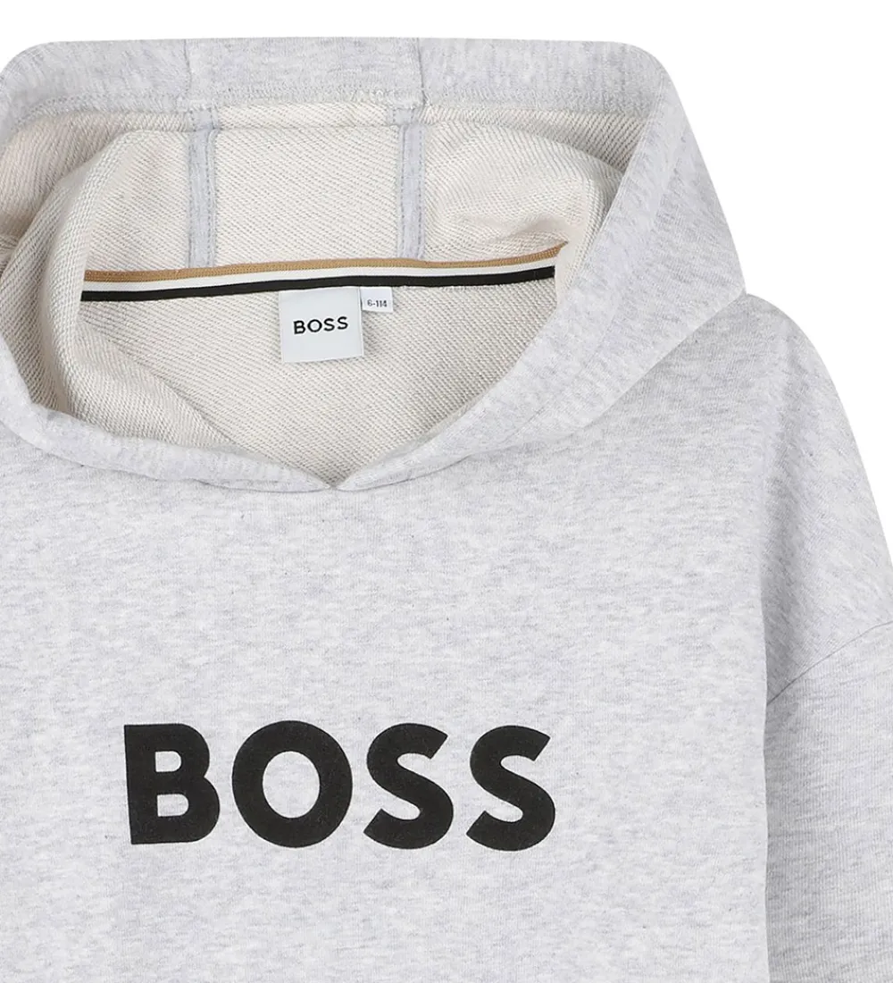 Elegant BOSS hættetrøje i gråmeleret sweat med et markant, sort logo printet på fronten. Hættetrøjen har en hætte med bomuldsfor, og fortil sidder der en praktisk kængurulomme. BOSS hættetrøjen har ribkanter for et klassisk look, og på indersiden er der blødt, børstet bomuld.